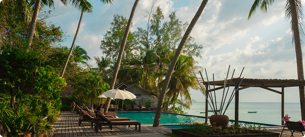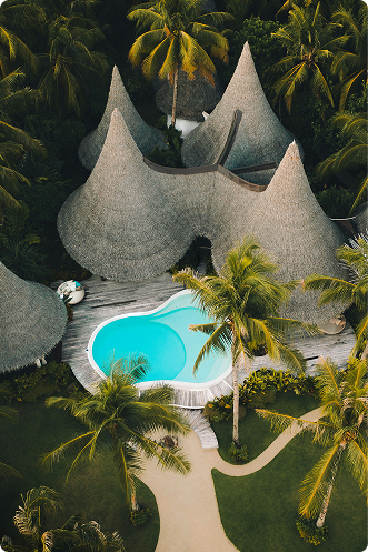 Khu nghỉ dưỡng lấy cảm hứng từ thiên nhiên và con người nơi đây vì vậy những thiết kế nghỉ dưỡng tại nơi đây cũng sử dụng các loại vật liệu tự nhiên như gỗ, tre, nứa, cọ,… giúp cho không gian nghỉ dưỡng hài hòa với thiên nhiên xanh mát.